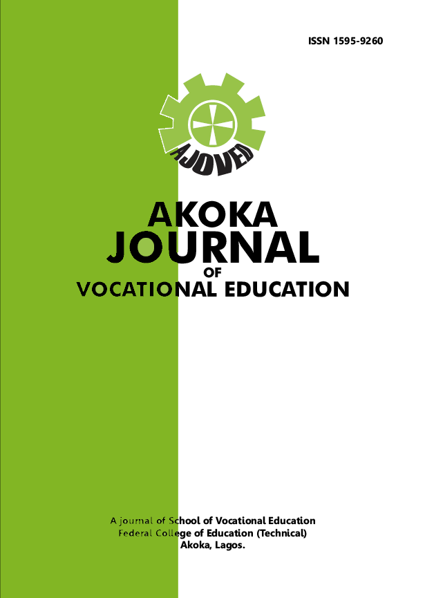 The Akoka Journal of Vocational Education (ISSN 1595-9260) is the official journal of the School of Vocational Education of the Federal College of Education (Technical) Akoka. It is a peer-reviewed publication and is published annually. The primary objective of AJOVED is to publish original articles emanating from any area of Agricultural Education, Fine and Applied Arts Education, Home Economics Education, Technical Education, Educational technology and related fields.